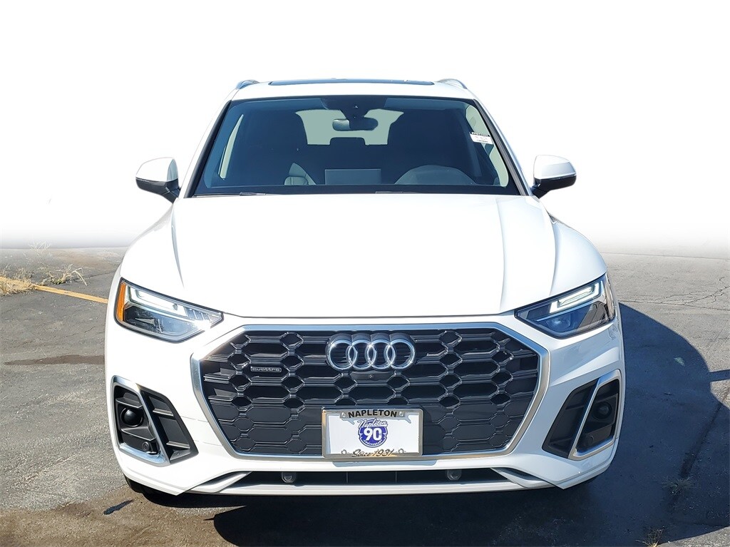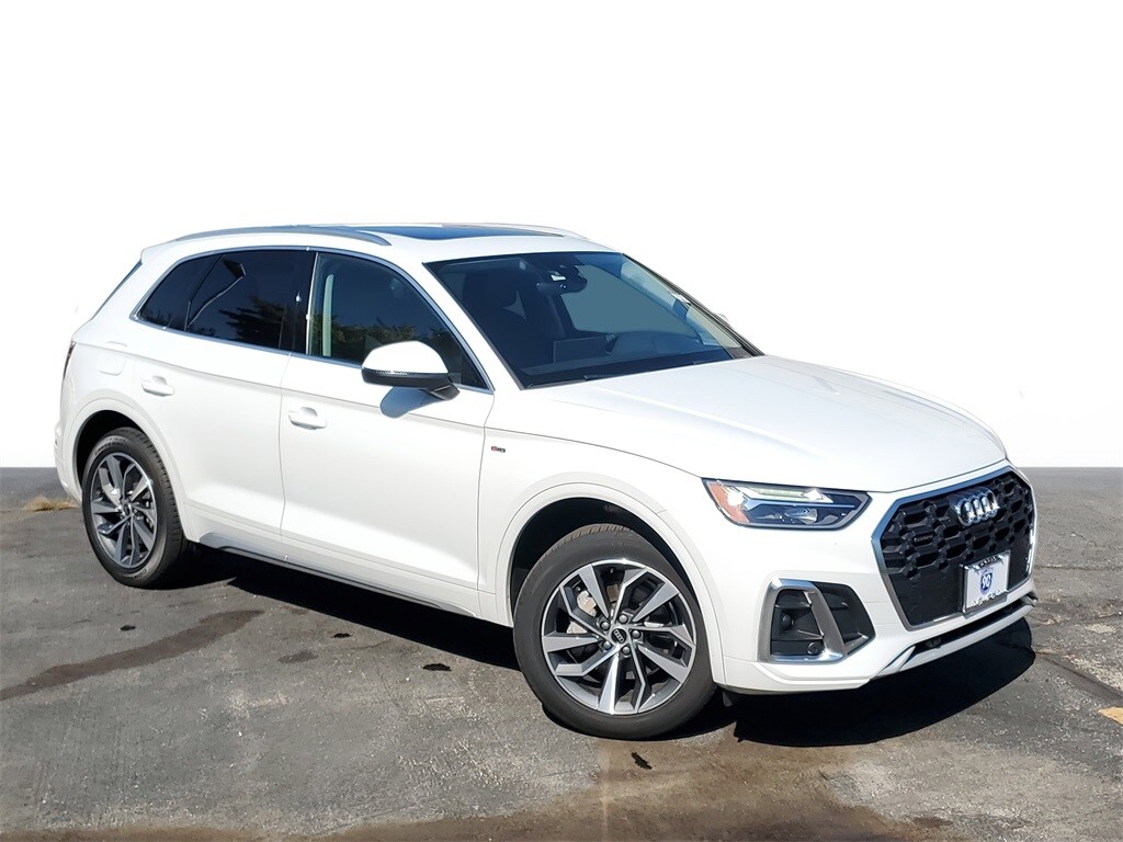 This Q5 is well equipped with Convenience Package (Audi Advanced Key, Auto-Dimming Power Folding Exterior Mirrors, Driver Seat Memory, Heated Steering Wheel, and SiriusXM All Access Service), Premium Plus Package (Adaptive Cruise Control w/Traffic Jam Assist, Audi Active Lane Assist, Audi Phone Box, Audi Virtual Cockpit Plus, Hands-On Detection Steering Wheel, Leatherette Covered Center Console & Door Armrests, Panoramic Sunroof, Power Adjustable Steering Column, Top View Camera System, and Wheels: 19" 5-Double-Arm Design Bi-Color Finish), Q5 45 S line Premium quattro, 4D Sport Utility, 2.0L Turbocharged, 7-Speed Automatic S tronic, quattro, Glacier White, Black w/Leather Seating Surfaces, 10 Speakers, 4-Wheel Disc Brakes, 5.302 Axle Ratio, ABS brakes, Air Conditioning, Alloy wheels, AM/FM radio, Audi Beam-Rings, Audi First Aid Kit, Audi Guard All-Weather Floor Mats (Set of 4), Audi Guard Wheel Lock Kit, Auto High-beam Headlights, Auto-dimming Rear-View mirror, Automatic temperature control, Bang & Olufsen Sound System w/3D Sound, Brake assist, Bumpers: body-color, Compass, Delay-off headlights, Driver door bin, Driver vanity mirror, Dual front impact airbags, Dual front side impact airbags, Electronic Stability Control, Emergency communication system: Audi connect CARE, Exterior Parking Camera Rear, Four wheel independent suspension, Front anti-roll bar, Front Bucket Seats, Front Center Armrest, Front dual zone A/C, Front fog lights, Front reading lights, Garage door transmitter: HomeLink, Genuine wood console insert, Genuine wood dashboard insert, Genuine wood door panel insert, Heated 8-Way Power Front Bucket Seats, Heated door mirrors, Heated front seats, Illuminated entry, Integrated Toll Module Delete, Leather Seating Surfaces, Leather Shift Knob, Low tire pressure warning, Occupant sensing airbag, Outside temperature display, Overhead airbag, Overhead console, Panic alarm, Passenger door bin, Passenger vanity mirror, Power door mirrors, Power driver seat, Power Liftgate, Power passenger seat, Power steering, Power windows, Privacy Trunk Cover, Radio data system, Radio: Audi Sound System, Rain sensing wipers, Rear air conditioning, Rear anti-roll bar, Rear fog lights, Rear reading lights, Rear seat center armrest, Rear window defroster, Rear window wiper, Remote keyless entry, Roof rack, Security system, Semiconductor Shortage Credit, Speed control, Speed-sensing steering, Speed-Sensitive Wipers, Split folding rear seat, Spoiler, Steering wheel mounted audio controls, Tachometer, Telescoping steering wheel, Tilt steering wheel, Traction control, Trip computer, Turn signal indicator mirrors, Variably intermittent wipers, and Wheels: 18" 5-Arm-Star Design.